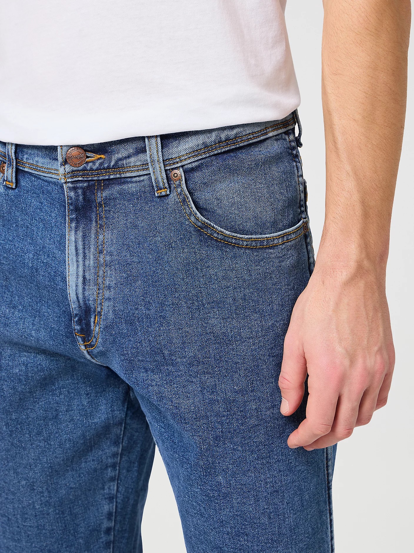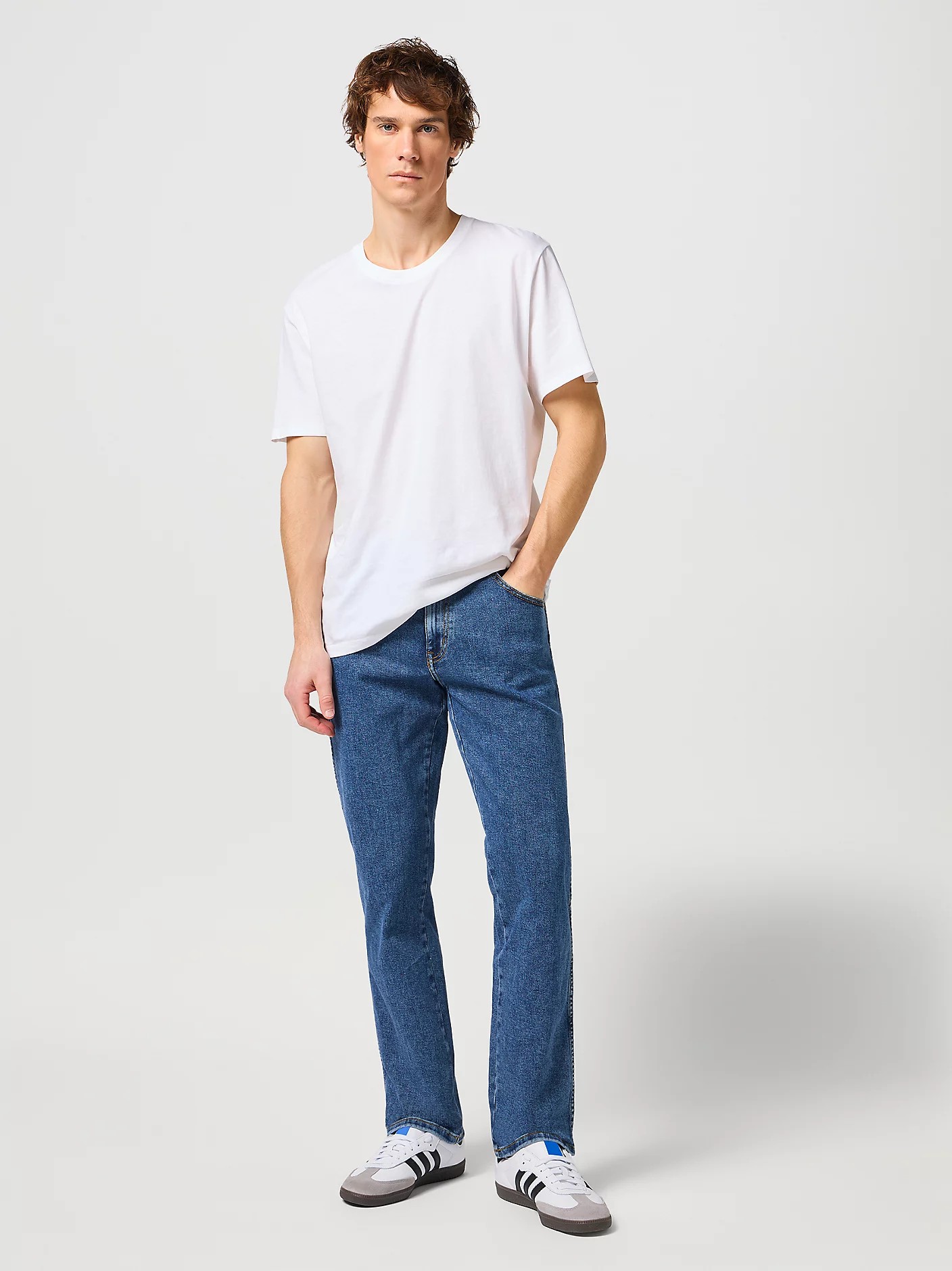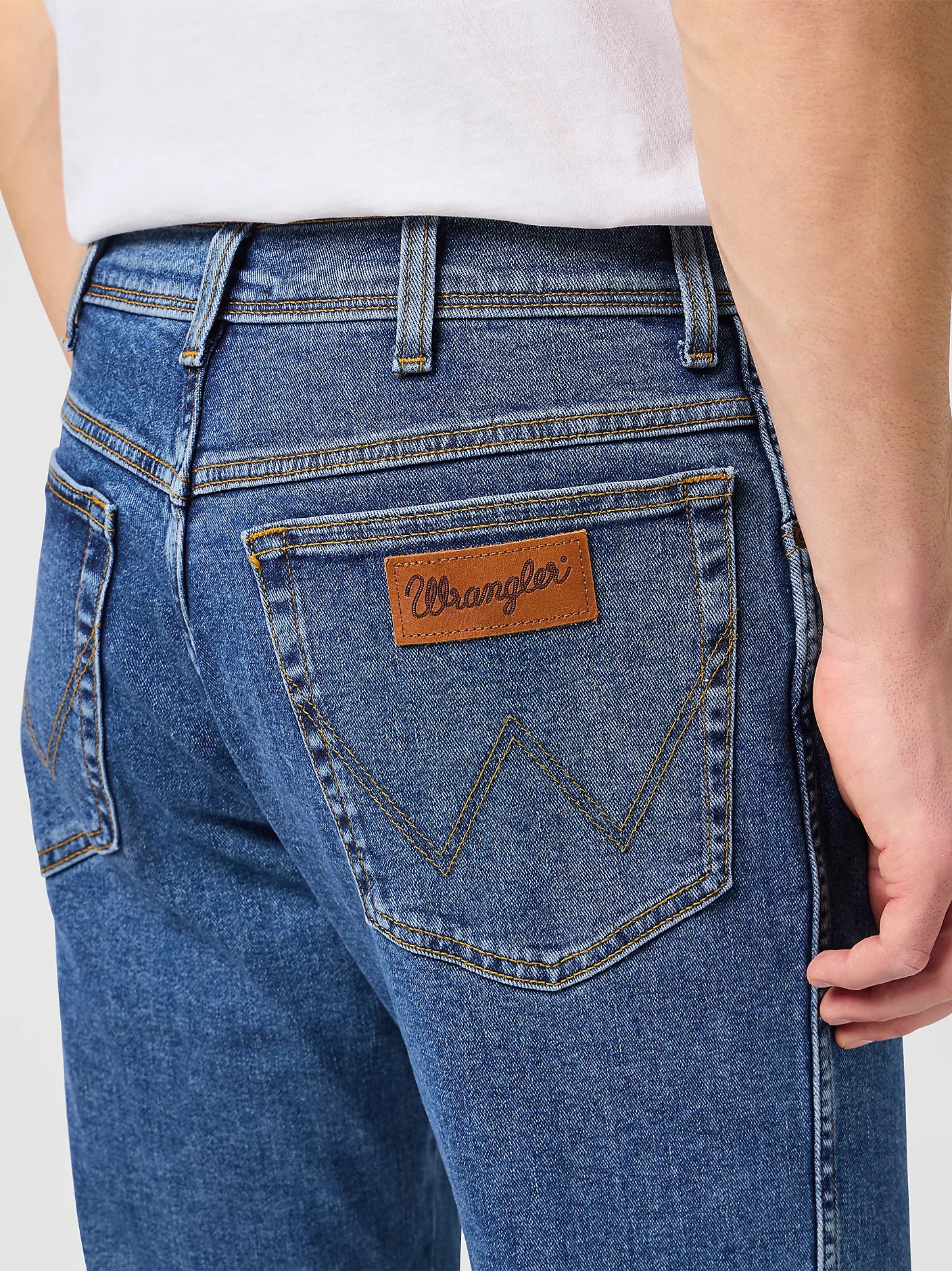 Аутентичные джинсы прямого кроя с классической средней посадкой. Выполнены из денима средней плотности с добавлением эластана, оттенок — выбеленный голубой (stonewash). Дизайн дополнен фирменной прострочкой Wrangler, кожаным патчем и медной фурнитурой. Универсальная модель, подходящая для повседневной носки.